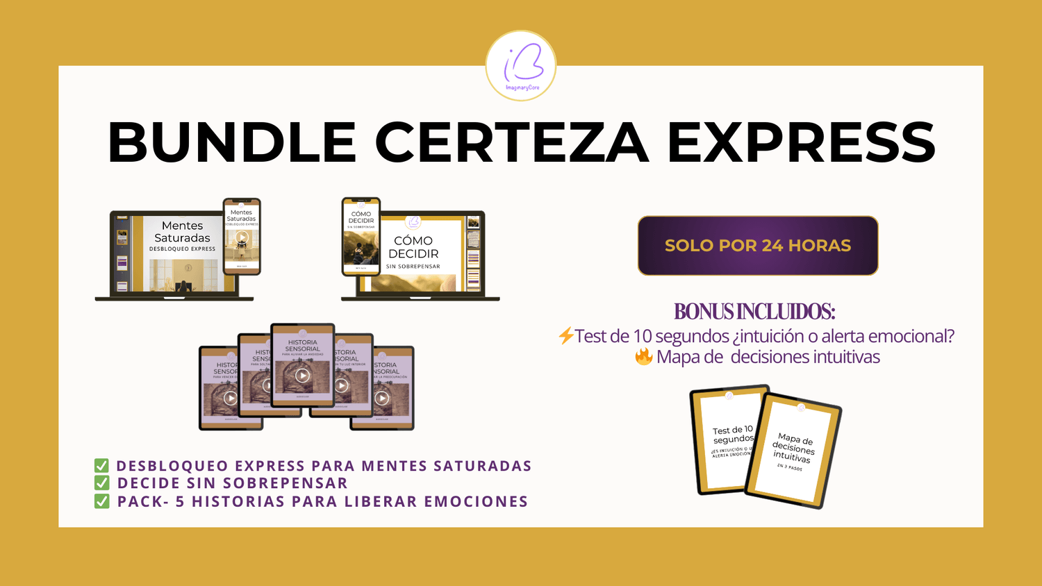 Descargas hoy mismo tus 2 audioclases rápidas que bajan el ruido mental y te ayudan a decidir + Pack de 5 historias para liberar emociones + 2 bonos express para tomar decisiones intuitivas